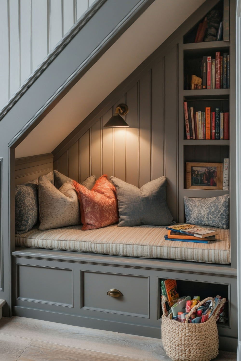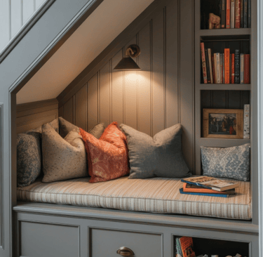 This tucked-away nook under the stairs is functional, beautiful, and full of cozy charm! With ample lighting, built-in shelving, and plush pillows, it’s the perfect spot to curl up with your next best-seller.